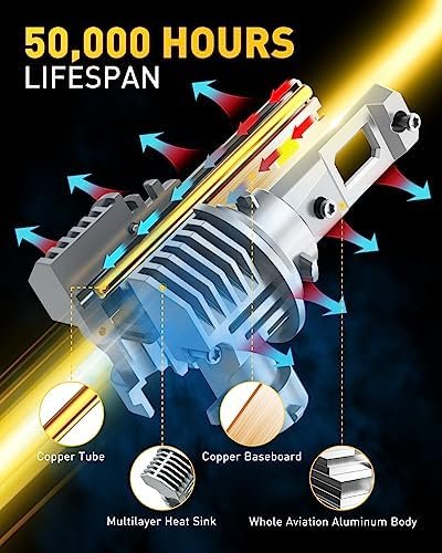 50,000 Hours Lifespan: Built-in copper tube and whole aviation aluminum body effectively pull the heat away from the LED chips to maximize the lifespan and performance of AUXITO 9005 H11 LED bulbs. Even being used 12 hours a day, the bulbs can also last more than 10 years.