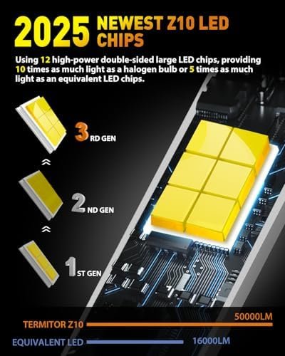 【Experience a Blazing 10X Brightness Boost】Enhance your driving journey with our high-power H11/H9/H8/H16 LED bulbs, boasting 12 advanced chips per light and an astounding 50,000LM brightness per set. Powered by cutting-edge Z10 technology, these lights deliver dependable and efficient illumination, ensuring an optimal nighttime driving experience.
