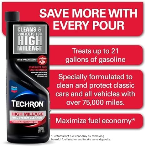 Techron High Mileage Fuel System Cleaner is specially formulated to clean and protect classic cars and all vehicles with over 75, 000 miles. It is formulated for gasoline powered, modern and classic, passenger cars, light trucks, and SUVs, including carbureted, two stroke, and port fuel injected engines. To keep the entire fuel system clean, use Techron High Mileage every 1, 000 miles or as needed for your high mileage vehicle. 1 One 12oz bottle treats up to 21 gallons of gasoline. Recommended for use in: Spark ignition engines with gasoline, ethanol and gasoline/ethanol blends Gasoline hybrid vehicles. Will not harm catalytic converters and oxygen sensors. Not recommended for diesel engines. Not for aviation.