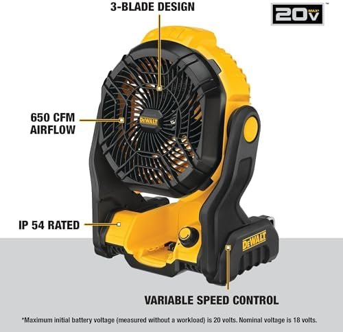 Enhance performance and comfort on hot work days with the 20V MAX* Cordless Jobsite Fan which delivers a powerful, concentrated air flow. With 20V MAX* compatibility, you can power this tool with the same battery you use with your other adaptable cordless tools. Conveniently stand it up, hang it, or mount it where you need so it is not in the way and choose the power setting you want with variable speed control. Battery & Charger Sold Separately