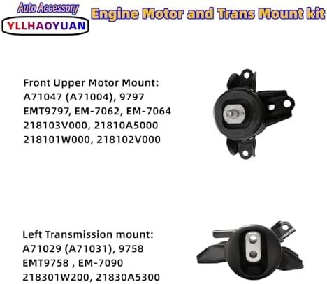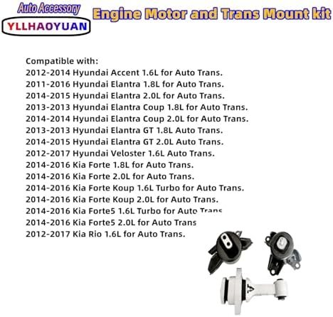 Compatible with:Engine Motor Mount set Fits for Hyundai Accent 1.6L 2012-2014, Hyundai El-an-tra 1.8L 2011-2016 / 2.0L 2014-2015, Hyundai Veloster 1.6L 2012-2017, Kia Forte 1.8L 2.0L 2014-2016, Forte Koup 1.6L 2.0L 2014-2016, Forte5 1.6L Turbo 2014-2016, Forte5 2.0L 2014-2016, Rio 1.6L 2012-2017 for Auto Trans. It fits the Model with Automatic Transmission.