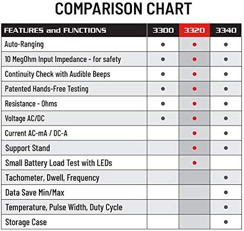 The INNOVA 3320 is an Auto-Ranging Multimeter designed to accurately troubleshoot a variety of automotive and household electrical problems. The auto-ranging scales eliminate the need to dial in the correct range when making electronic measurements. The 10 MegOhm input is safe for automotive and household uses (i. e., household outlets, fuses, wiring, general-purpose batteries, vehicle battery and charging system, automotive circuits and more). The color-coded LEDs allow you to quickly check household batteries (green = good, yellow = weak and red = replace). Includes attachable test leads, holders and stand for hands free use and features protective rubber corner guards for drop protection. The INNOVA 3320 has a single setting resistance function for AC and DC voltage.