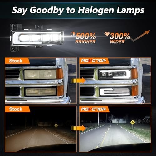 Super Bright All-in-one LEDs: MOVOTOR LED headlights assembly has multi-functions: high beam, low beam, amber turn signal, white DRL. The unique design welcome DRL function: the white halo will sequence on both headlights and turn signal lights when you firstly turn on the DRL. With advanced Led chips, these led headlights is 500% brighter than the stock headlights, effectively eliminate blind area,ensure your safety driving in any harsh weather.