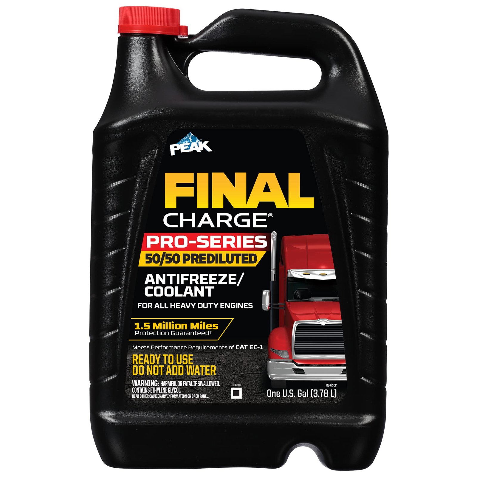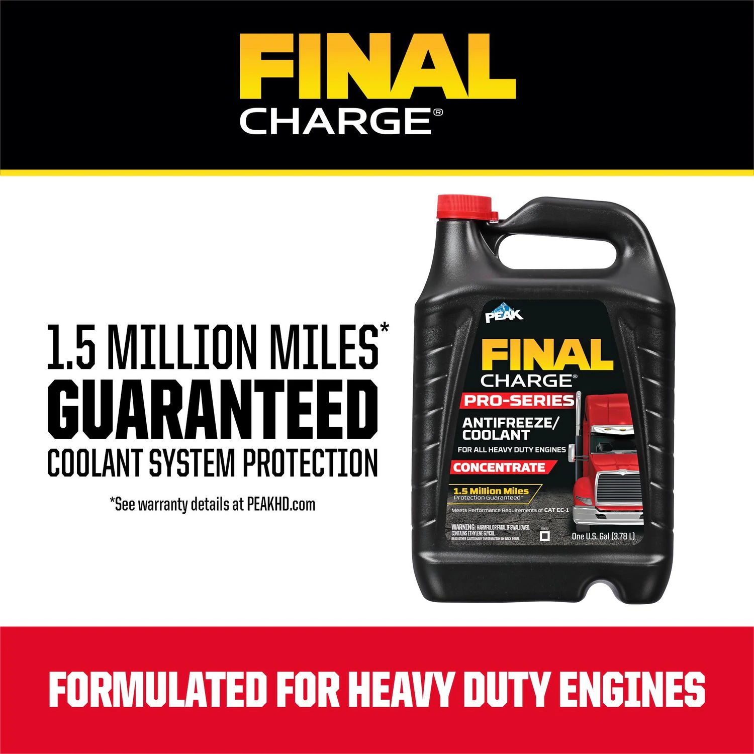 FINAL CHARGE® PRO-SERIES Antifreeze/Coolant is an advanced technology formula engineered to deliver the highest level of performance for today’s heavy duty engines. Its stabilized Phosphate enhanced Organic Acid Technology (POAT) corrosion inhibitor system provides fast-acting long-lasting protection to all cooling system metals including Controlled Atmosphere Brazed (CAB) and cast aluminum components. Scale-fighting inhibitors help prevent deposit formation to maximize heat transfer. FINAL CHARGE® PRO-SERIES Antifreeze/Coolant is free of nitrite and 2-ethylhexanoic acid and is compatible with all system gaskets and hose materials. With proper maintenance, FINAL CHARGE® PRO-SERIES Antifreeze/Coolant delivers guaranteed cooling system protection for 1.5 million miles, 10 years, or 36,000 hours, whichever comes first, without the use of Supplemental Coolant Additives (SCAs).